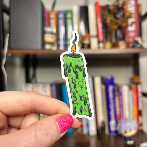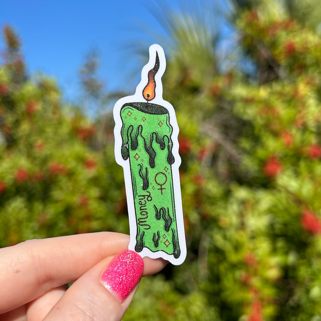 Put this mini money spell candle somewhere you see it often! It never stops burning! Let it act as a money-attracting, good luck charm! This is inspired by my love for making homemade spell candles in my free time. I usually carve symbols into the real candles with a toothpick, so I wanted to take that concept and turn it into a sticker. Along with "money" on the side, this candle sticker also features the Venus planetary glyph, which is associated with pleasure, beauty, luxury, and money!