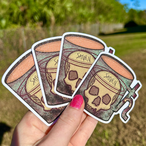 The mug's handle is the Saturn symbol and the skull has rings around it like the actual planet. 🪐