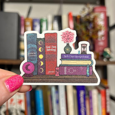 Inspired by my own book shelf as an astrologer! I went with a dark academia vibe and tried to squeeze a lot of symbolism into this little glittery guy. You'll see the Venus glyph on the pink candle, the Saturn glyph on the hourglass, and the lunar symbols. š©µš„¹